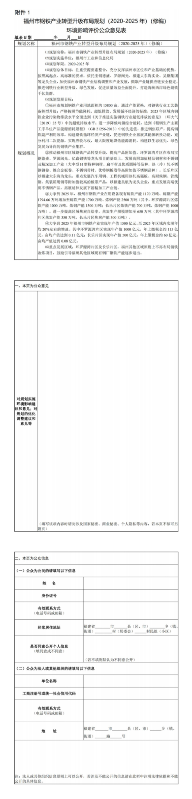 福州市鋼鐵產業轉型升級布局規劃(2020-2025年)(修編)環境影響評價公眾參與首次公示