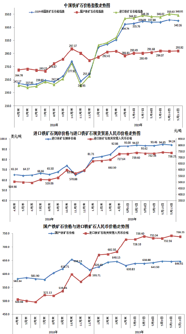 5月13日,中國鐵礦石價格指數(CIOPI)340.16點,環比下降1.25點,降幅為0.37%。其中:國產鐵礦石價格指數為293.92點,環比上升0.14點,升幅為0.05%;進口鐵礦石價格指數為348.91點,環比下降1.52點,降幅為0.43%。