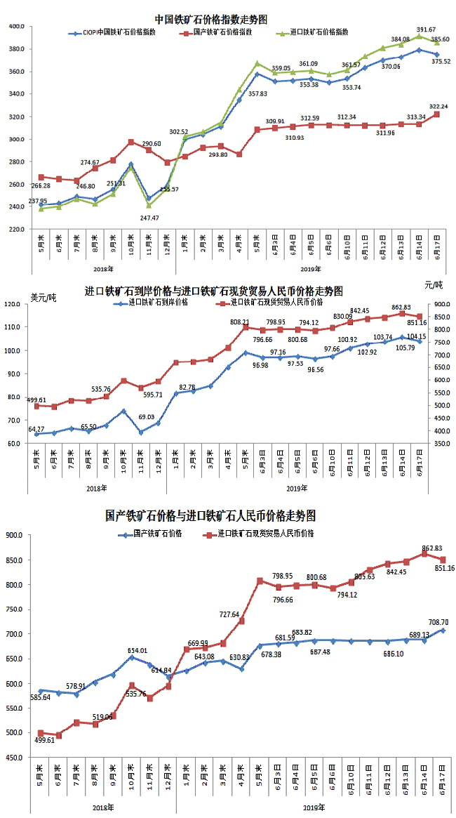 6月17日,中國鐵礦石價格指數(CIOPI)375.52點,環比下降3.69點,降幅為0.97%。其中:國產鐵礦石價格指數為322.24點,環比上升8.90點,升幅為2.84%;進口鐵礦石價格指數為385.60點,環比下降6.07點,降幅為1.55%。