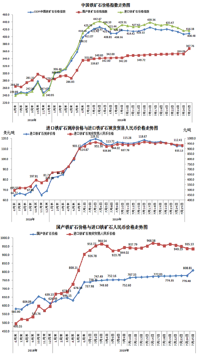 7月25日,中國鐵礦石價格指數(CIOPI)408.48點,環比上升1.99點,升幅為0.49%。其中:國產鐵礦石價格指數為367.76點,環比上升14.70點,升幅為4.16%;進口鐵礦石價格指數為416.18點,環比下降0.41點,降幅為0.10%。