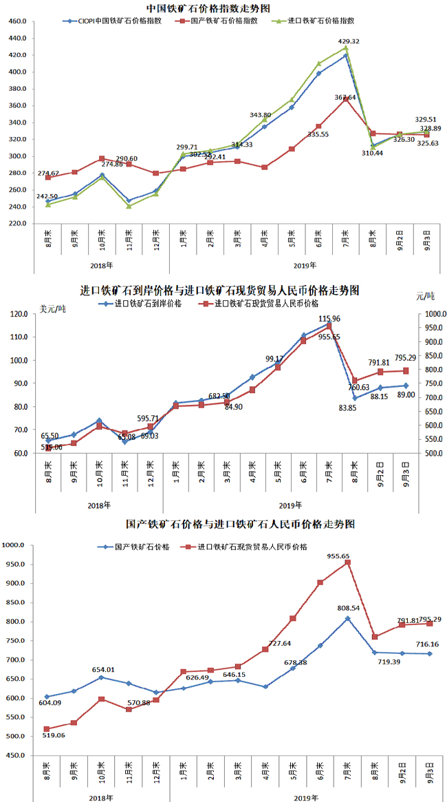 9月3日,現貨貿易進口鐵礦石62%品位幹基粉礦人民幣含稅價格為795.29元/噸,環比每噸上升3.48元,升幅為0.44%,當月平均價格為793.55元/噸。
