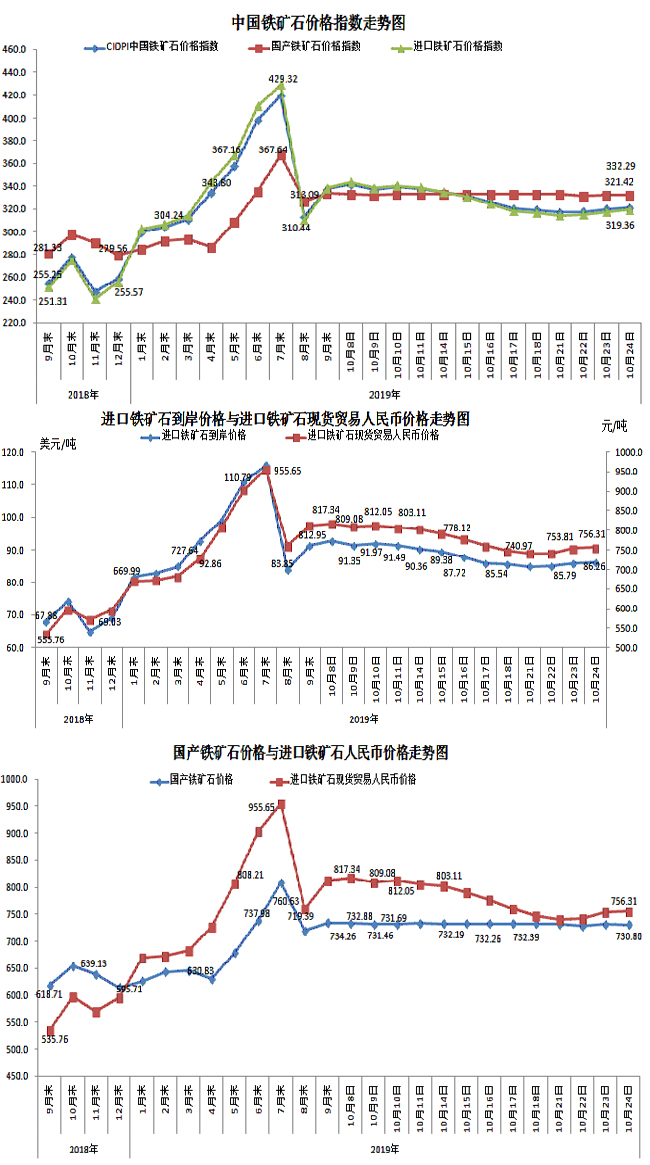 10月24日,中國鐵礦石價格指數(CIOPI)321.42點,環比上升1.41點,升幅為0.44%。其中:國產鐵礦石價格指數為332.29點,環比下降0.33點,降幅為0.10%;進口鐵礦石價格指數為319.36點,環比上升1.74點,升幅為0.55%。