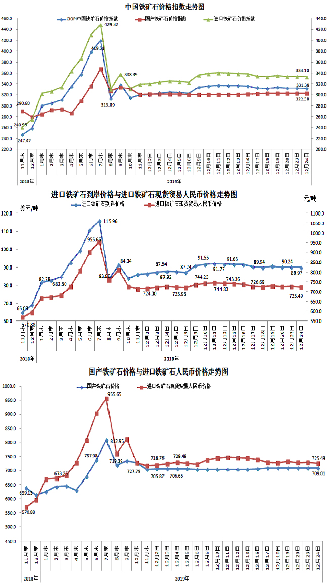 12月24日,中國鐵礦石價格指數(CIOPI)331.39點,環比下降0.84點,降幅為0.25%。其中:國產鐵礦石價格指數為322.38點,環比持平;進口鐵礦石價格指數為333.10點,環比下降1.00點,降幅為0.30%。