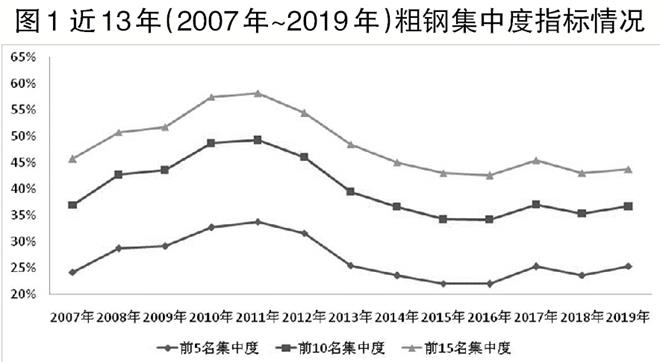 根據各年度12月份《中國鋼鐵工業統計月報》,計算出2007年~2019年各年度的表觀性粗鋼集中度指標(見圖1)。