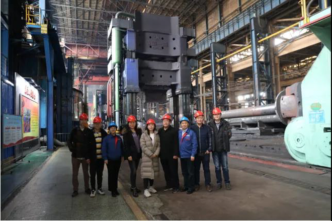 圖為攝製項目組一行參觀萬噸水壓機生產現場
