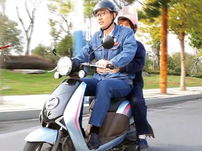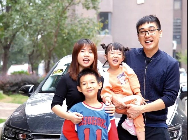 左圖為文亮鴻騎電動車上班。右圖為文亮鴻與家人在轎車前合影。(方大九鋼 供圖)