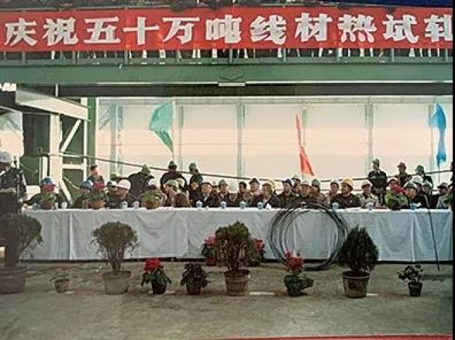 右圖為1987年4月15日鞍鋼線材股份有限公司50萬噸線材軋機熱試紮成功。(鞍鋼線材 供圖)