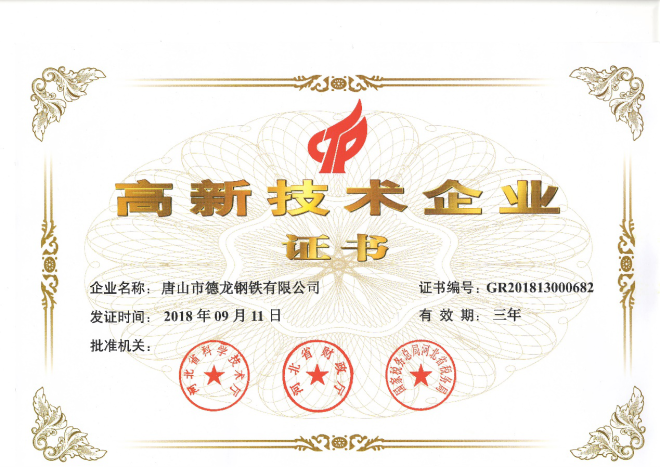 現在,唐山德龍已經獲專利授權78項,其中發明專利24項,實用新型專利54項;擁有省、市、國家優秀質量管理成果60餘項,市級優秀技術創新成果一等獎2項、二等獎2項、三等獎3項,省工信廳認定新產品2項,省重點研發項目1項,省冶金科學技術二等獎2項、三等獎4項,卓越產品認證2項,金杯產品認證4項(H08A、H08E、H10Mn2、ER70S-6)。多項技術達到國際先進、國內領先水平。公司被評為國家高新技術企業、河北省技術創新示範企業、河北省創新引領型領軍企業。