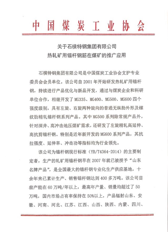 50.62%,53.33%,51.08%,來自中國煤炭工業協會煤礦支護委員會的一份報告顯示石橫特鋼集團有限公司(以下簡稱石橫特鋼)錨杆用熱軋帶肋鋼筋產品國內市場占有率連續三年過半穩居第一;