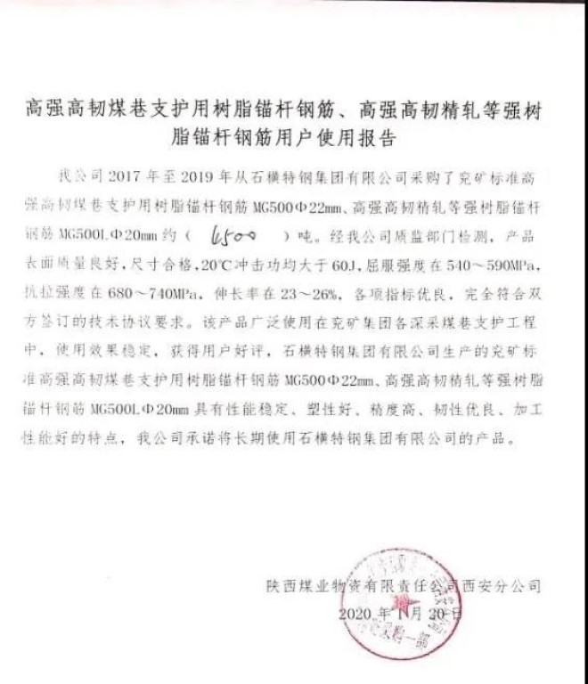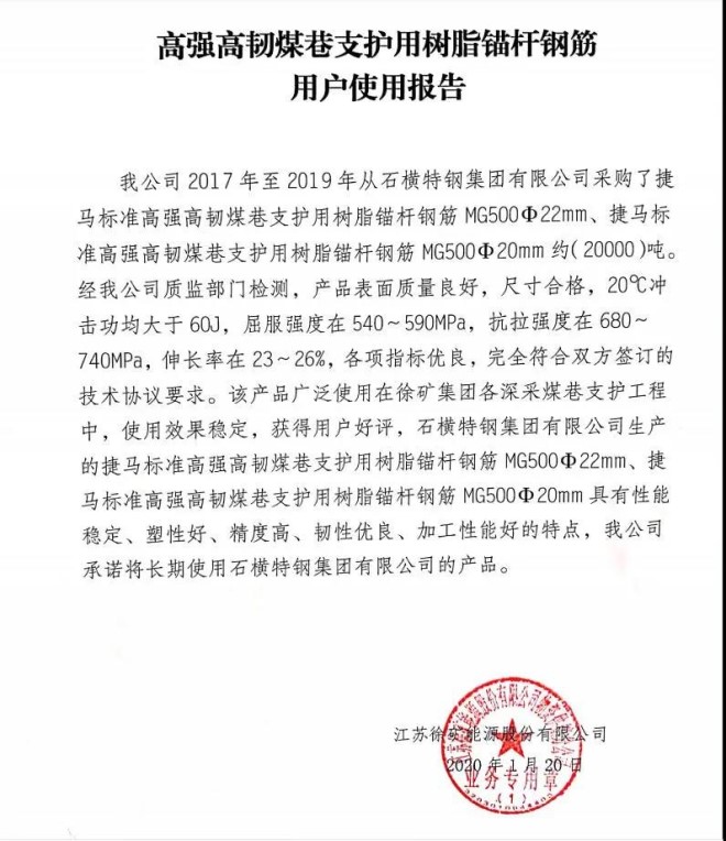 “我公司隨後第一時間將個性化定製的高強錨杆鋼(SKW5)送到現場,解決了客戶的燃眉之急,確保了巷道支護安全,客戶對此交口稱讚。由此成為石橫特鋼忠誠的直供礦務局客戶。”趙峰介紹。