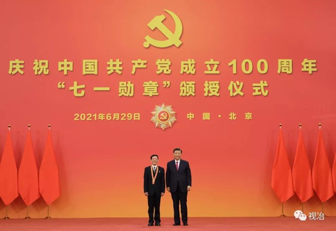 2021年6月29日,慶祝中國共產黨成立100周年“七一勳章”頒授儀式在北京人民大會堂金色大廳隆重舉行。中共中央總書記、國家主席、中央軍委主席習近平向“七一勳章”獲得者艾愛國頒授勳章。(新華社記者 李學仁 攝)