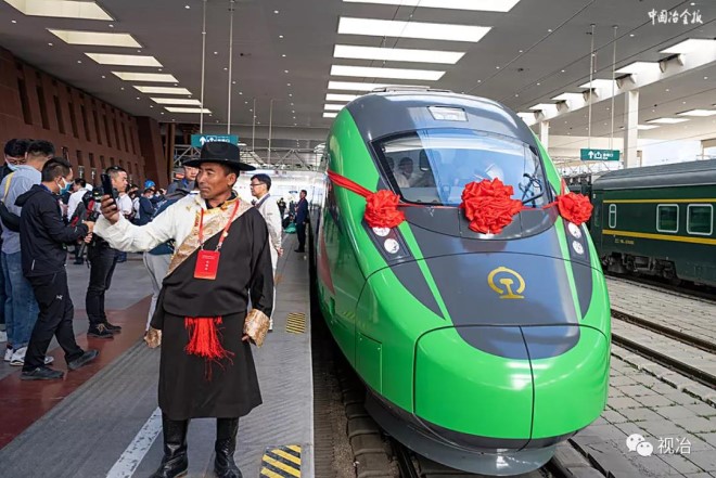 上圖為“複興號”動車組開動前,一位藏民在動車組前拍照留念。(通訊員 丁慶斌/攝 記者 白立新/文)