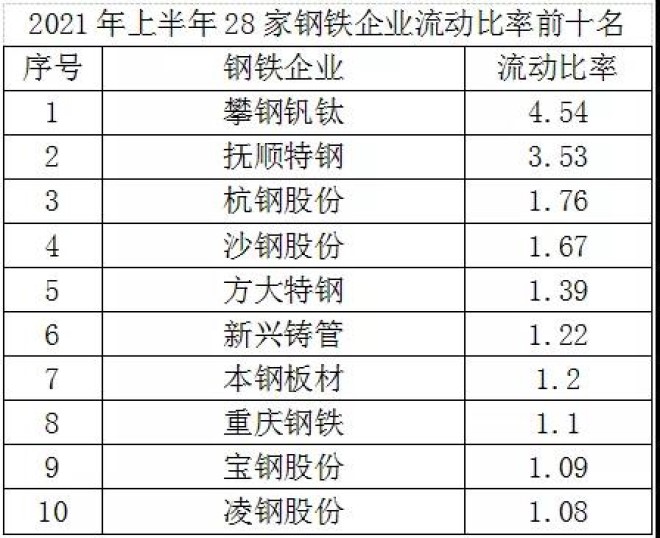 從流動比率看,2021年上半年28家鋼鐵企業的平均流動比率為0.86,較2020年上半年增加0.08,盡管短期償債能力有所改善,但由於流動資產不能完全覆蓋流動負債,短期償債能力仍然較弱。在28家鋼鐵企業中,流動資產能覆蓋流動負債的有14家,流動比率最高的是攀鋼釩鈦,達到4.54。