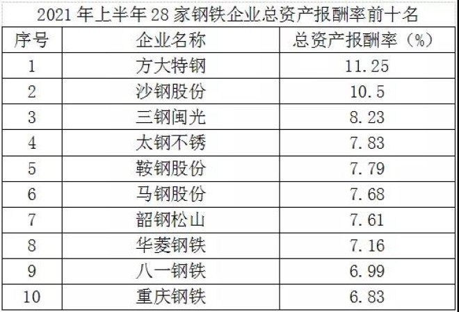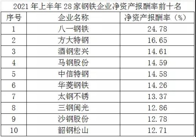 從資產報酬率看,2021年上半年28家鋼鐵企業平均總資產報酬率為5.37%、淨資產報酬率為9.34%,較2020年上半年分別增加2.62和5.59個百分點,反映出鋼鐵企業資產利用效率提高,盈利能力增強。在28家鋼鐵企業中,平均總資產報酬率、淨資產報酬率較2020年上半年都增加的有27家,都下降的有1家。