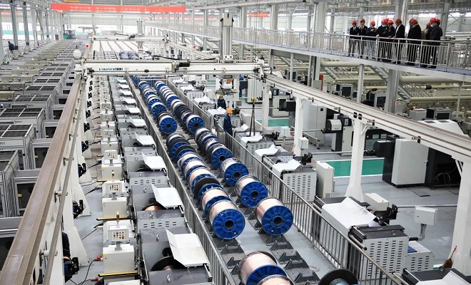 圖為技術調研組領導專家在晉南鋼鐵恒瑞昆鍍銅焊絲車間參觀