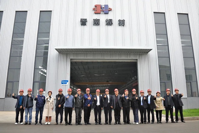 圖為技術調研組領導專家在晉南鋼鐵恒瑞昆鍍銅焊絲車間參觀交流
