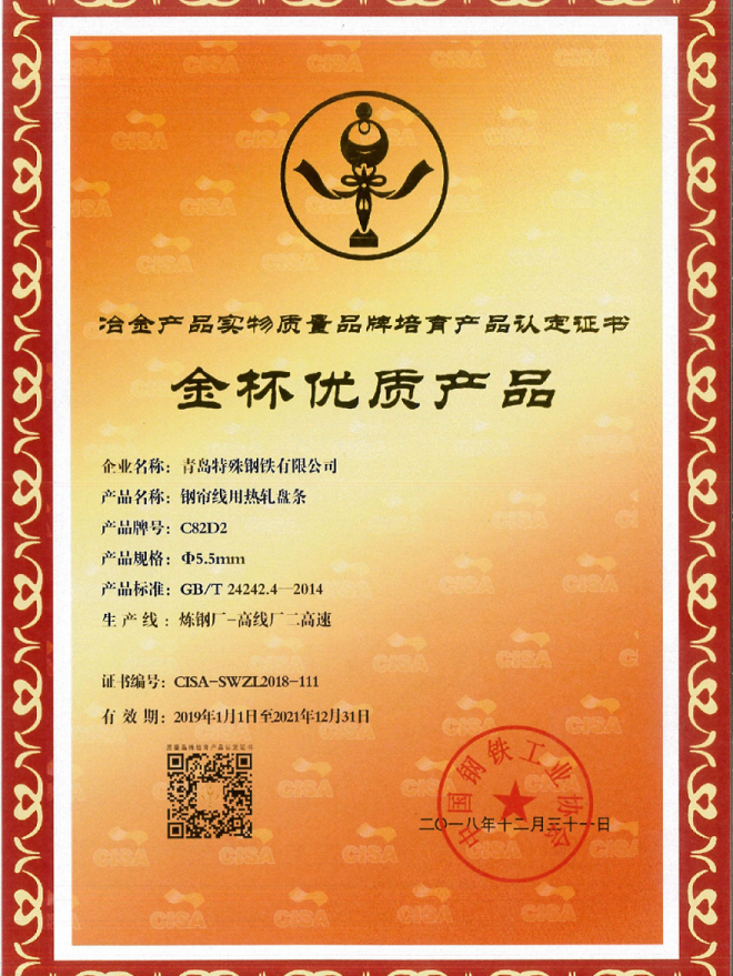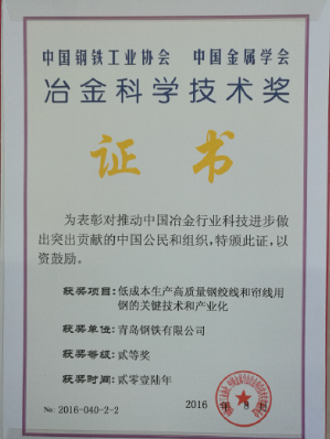 經過多年的深耕,青島特鋼在簾線鋼領域收獲了多項榮譽。其中,“高質量硬線鋼低成本生產的關鍵技術”獲得2017年國家科技進步獎二等獎,“低成本生產高質量鋼絞線和簾線用鋼的關鍵技術和產業化”獲得2016年冶金科學技術獎二等獎,青島特鋼鋼簾線用熱軋盤條獲得2018年冶金產品實物質量“金杯獎”,等等。