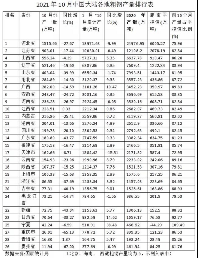 從最新粗鋼產量數據來看,寧夏是唯一一個前10個月粗鋼產量超過去年整年粗鋼產量(平控值)的省份,接近超過10%;甘肅、廣西、雲南、吉林、新疆等地粗鋼壓產任務相對較重。從前10個月累計粗鋼產量來看,天津同比降幅最大,下降15.51%;其次是河北省,同比降幅為9.99%;同比增幅最大是寧夏,為38.48%.(詳見下表)