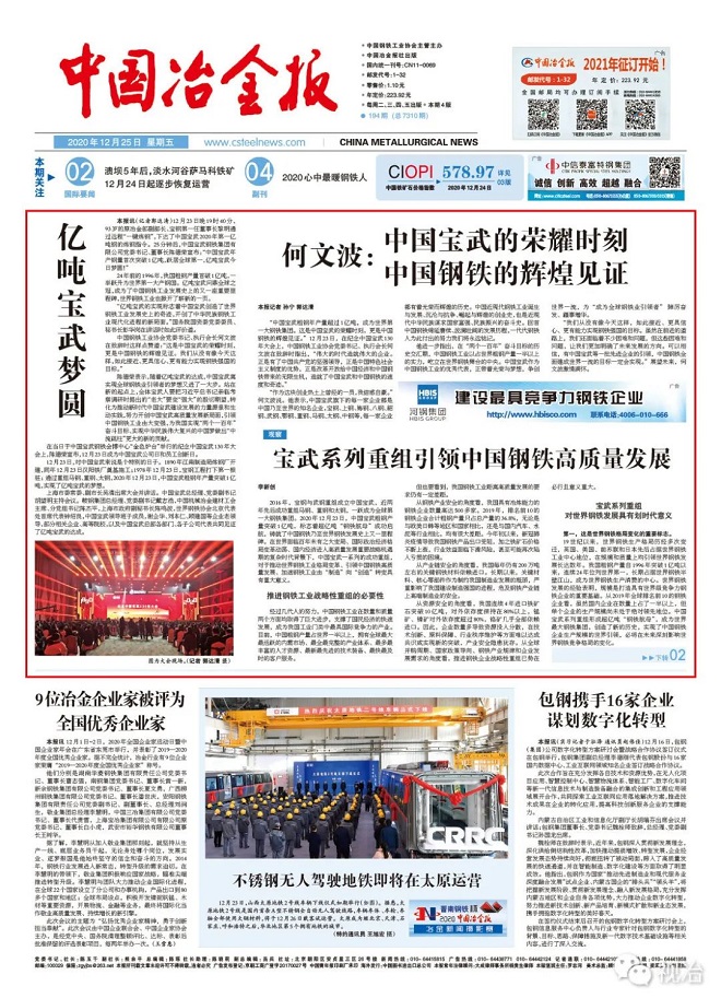 ▲2020年12月25日《中國冶金報》刊發的中國寶武年產鋼量突破1 億噸的報道