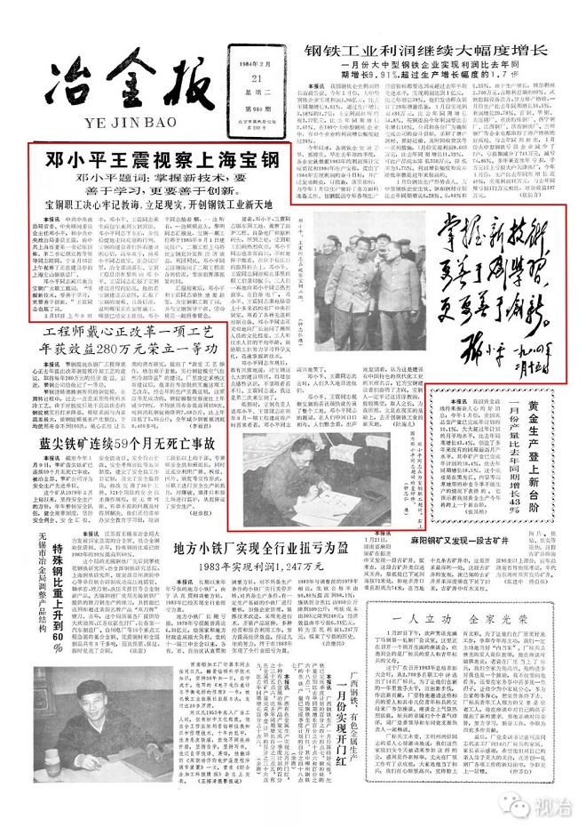 ▲1984年2月21日《冶金報》刊發的鄧小平視察寶鋼並題詞的報道
