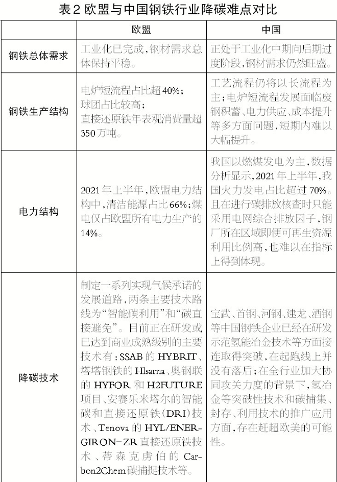 相對於歐美發達國家,我國鋼鐵行業碳減排任務更加艱巨(見表2)。當前我國仍處於工業化進程中,鋼鐵行業既要在產量上維持一定規模以支撐國民經濟增長和基礎設施建設,自身也麵臨超低排放改造、產品升級等可能增加碳排放的升級。鋼鐵行業必須為實現碳排放總量達峰做出重大貢獻以支撐全國2030年nian碳tan達da峰feng目mu標biao的de實shi現xian。鋼gang鐵tie產chan量liang達da峰feng和he行xing業ye碳tan達da峰feng的de時shi間jian間jian隔ge將jiang非fei常chang短duan,甚shen至zhi可ke能neng同tong步bu,同tong時shi又you沒mei有you現xian成cheng的de經jing驗yan可ke以yi借jie鑒jian,難nan度du是shi其qi他ta國guo家jia都dou不bu曾zeng遇yu到dao過guo的de。