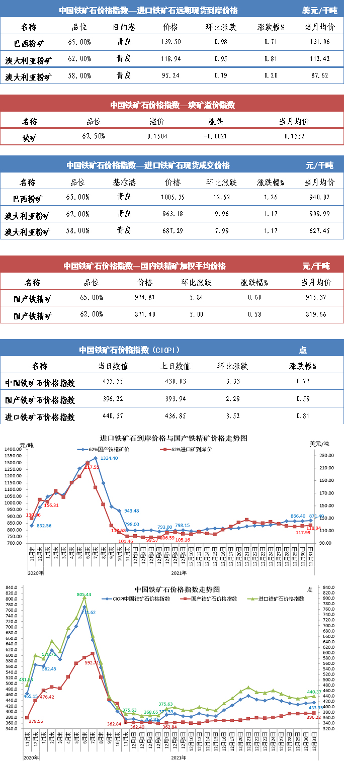 【行業指數】12月31日中國鐵礦石價格指數