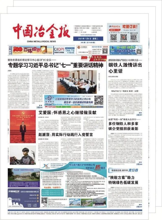 《中國冶金報》聚焦鋼鐵企業各級黨委深入學習領會習近平總書記重要講話精神,宣傳企業采取的集中學習、個人自學、組織研討班、舉辦報告會、學習交流會等多種形式的學習,把企業在學習過程中的好做法、好經驗在《學習“七一”重要講話精神》欄目中進行展示。