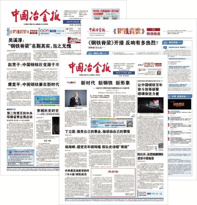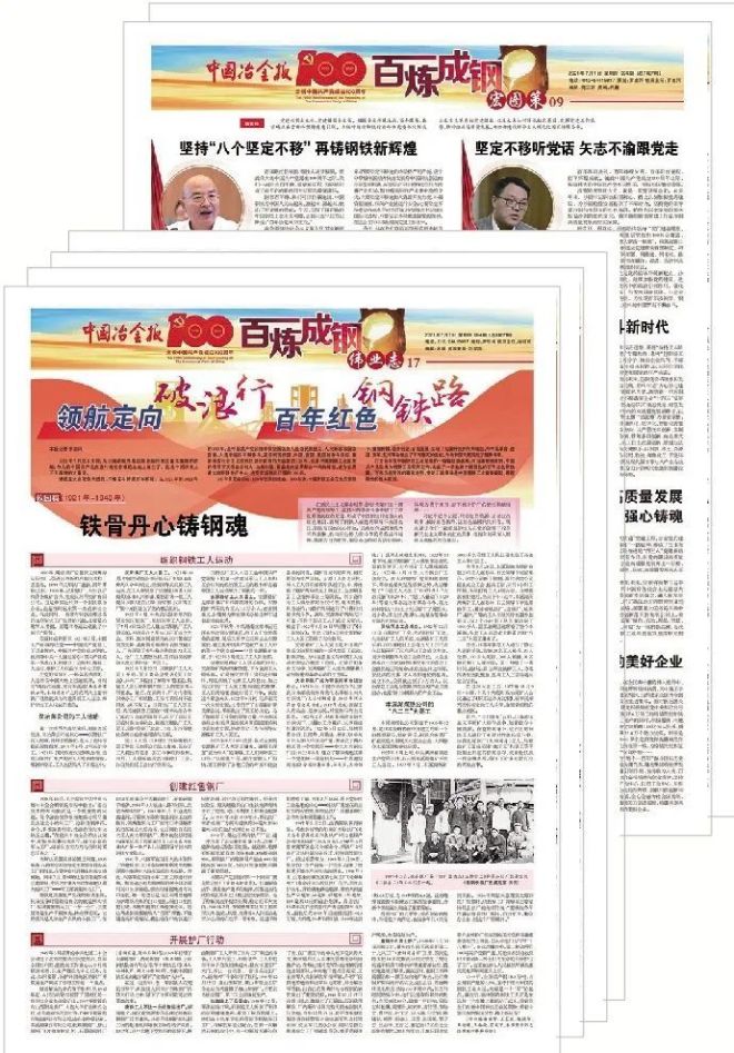今年7月1日當天,《中國冶金報》隆重推出60塊版內容豐富、精彩紛呈的建黨百年特刊——《百煉成鋼》。該特刊一經推出,立即在行業內外引起強烈反響,並獲得中國記協點讚。中國記協網發文稱,《百煉成鋼》特刊將報道視角放眼全國,突出鋼鐵特色,聚焦紅色元素、鋼鐵故事、鋼鐵亮點,在注重曆史厚度、空間廣度的同時突出時代高度,為推動鋼鐵行業高質量發展彙聚了強大的正能量。