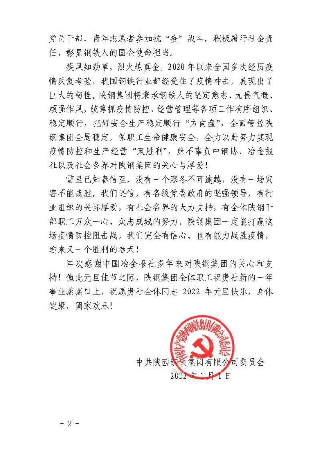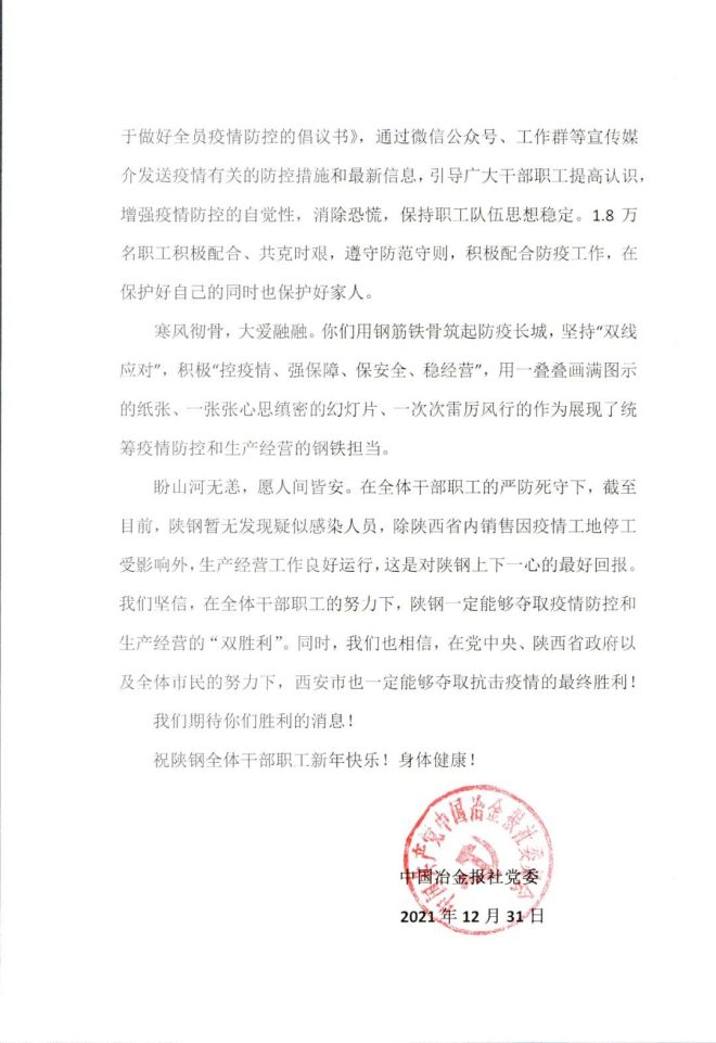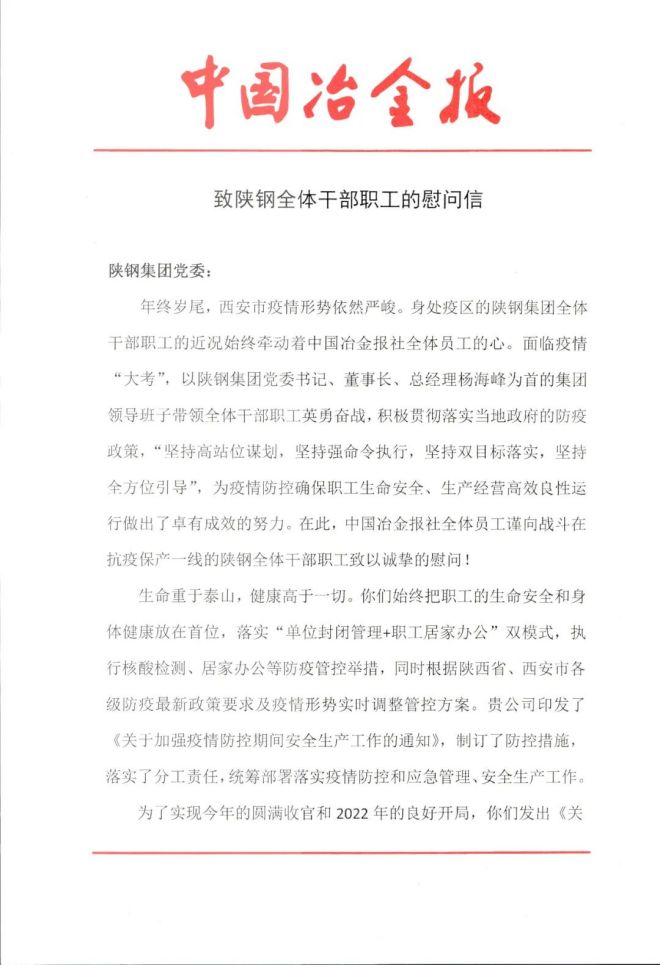 年終歲尾,西安市的疫情仍然嚴峻。中國冶金報社心係身處疫區的陝鋼集團,以一封信向積極落實防疫政策、在抗疫保產一線英勇抗戰的陝鋼員工們致以誠摯的慰問。