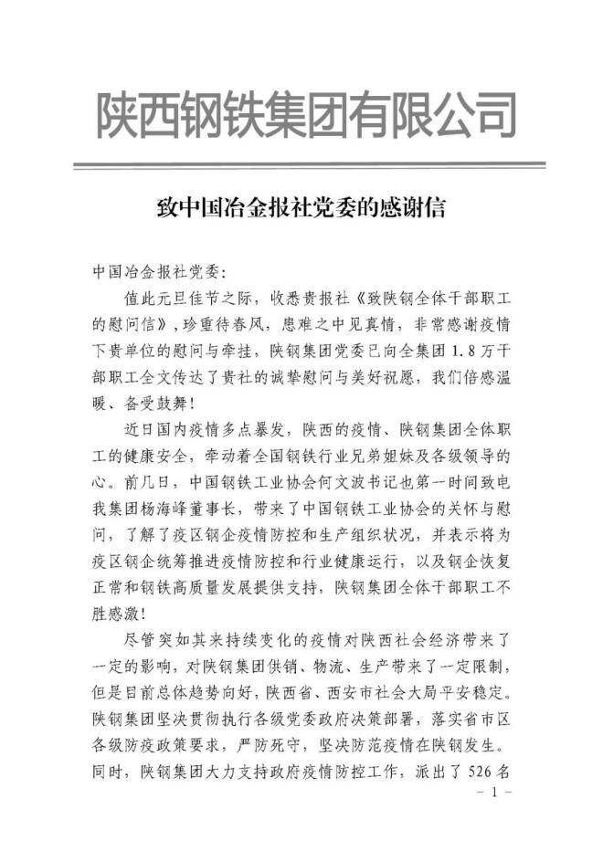 陝鋼集團向中國冶金報社的慰問表示感謝