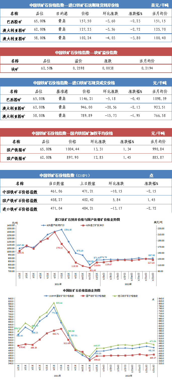 【行業指數】1月13日中國鐵礦石價格指數