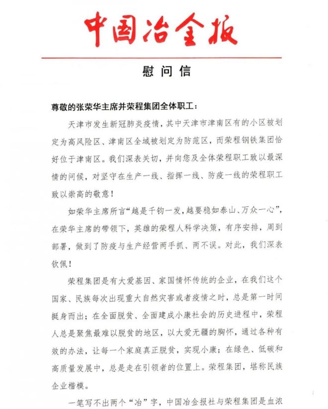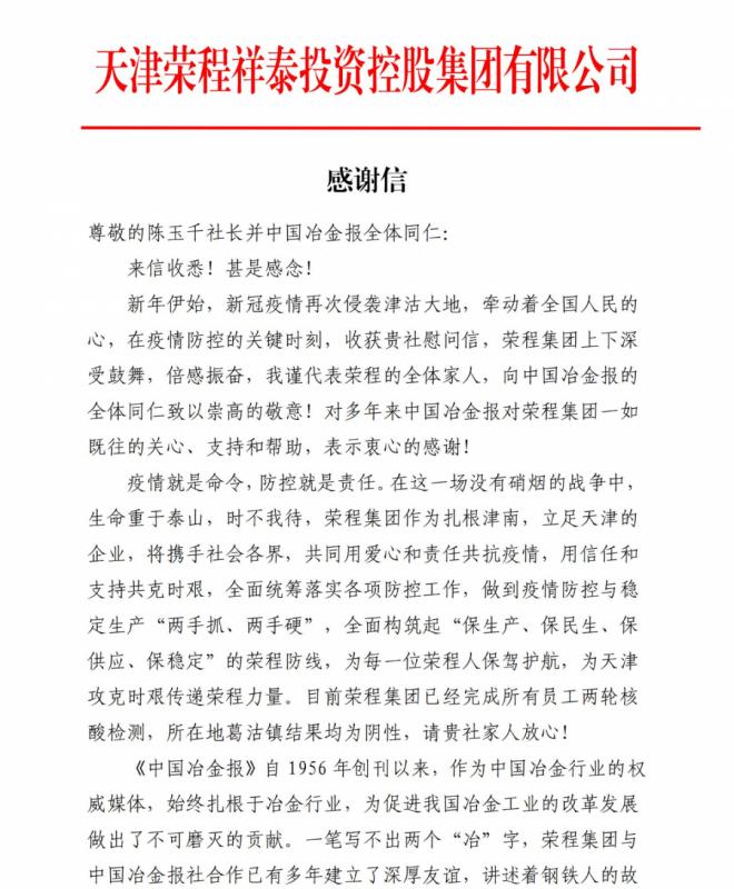 1月14日,榮程集團向中國冶金報社發來感謝信,表示在疫情防控的特殊時期,報社的慰問與支持,讓榮程集團上下深受鼓舞,倍感振奮。