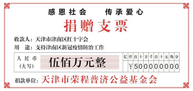 榮程集團通過榮程普濟公益基金會向天津抗疫一線捐款共計1500萬元,助力天津“硬剛”奧密克戎。截至目前,500萬元已捐贈給津南區抗疫一線,1000萬元將進一步支援天津全市多項抗疫工作。