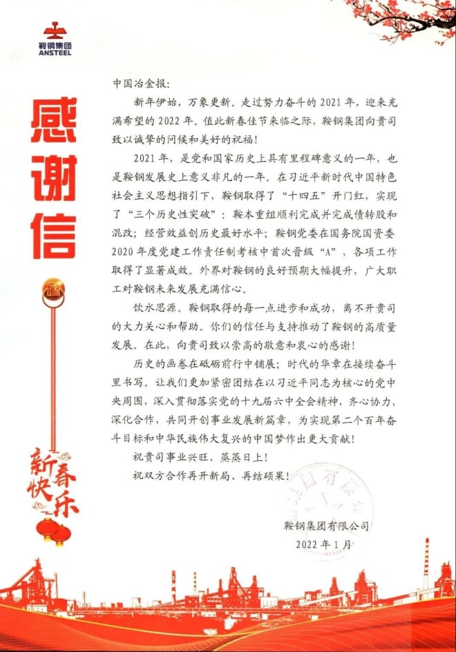 鞍鋼集團致中國冶金報社的感謝信