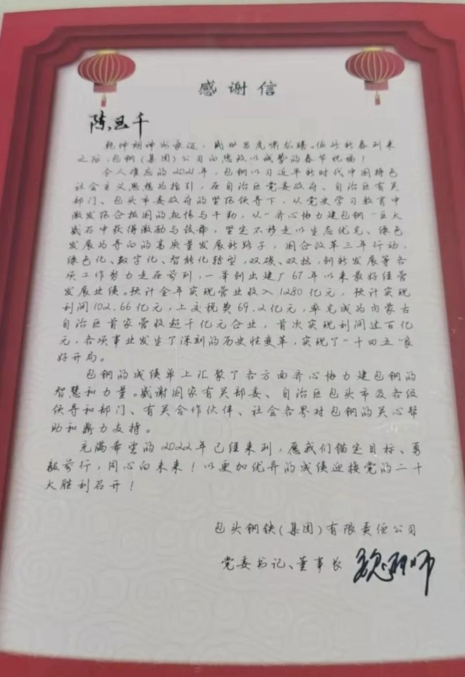 來信收悉!對包頭鋼鐵(集團)有限責任公司(以下簡稱包鋼集團)在過去的2021年中,在各方麵工作所取得的曆史性成就表示最熱烈的祝賀,並從內心深處感到無比振奮、無比欣慰!
