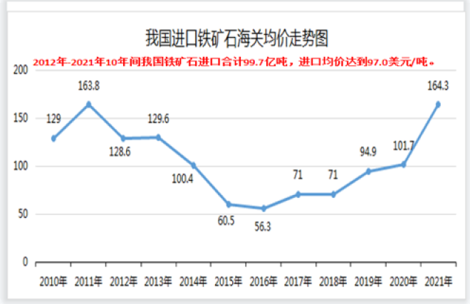 2021年,全國粗鋼產量10.33億噸,同比下降3.0%;全球粗鋼產量19.5億噸,中國占比52.9%。2021年,全國鋼材出口量6690萬噸,同比增長24.6%;鋼材進口量1427萬噸,同比下降29.5%。2021年,全國粗鋼表觀消費量9.92億噸,同比減少5578萬噸,降幅5.3%。2021年12月末,重點統計企業鋼材庫存1130萬噸,同比減少32萬噸,降幅為2.8%;全國主要鋼材市場五種鋼材(中板、冷軋薄板、熱軋薄板、線材和螺紋鋼)社會庫存量為776萬噸,同比增加46萬噸,增幅為6.3%。2021年,CSPI鋼材綜合指數平均值為142.03點,同比增長32.93%。2021年末,螺紋鋼價格為4604元/噸(2020年為4236元/噸,2019年為3733元/噸);熱軋卷板價格為4823元(2020年為4663元/噸,2019年為3953元/噸)。2021年,我國累計進口鐵礦石11.24億噸,同比下降3.9%,進口均價高達164.3美元/噸。2021年12月末,全國進口鐵礦石港口庫存量為1.56億噸,與2019年3月的前期高點1.47億噸相比,增加923萬噸。2021年12月末,巴西和西澳至青島的海運費分別為22.2美元/噸和8.8美元/噸,同比分別上漲38.0%和8.3%。2021年,重點統計鋼鐵企業營業收入69308億元,同比增長32.7%;利潤總額3524億元,同比增長59.7%;銷售利潤率5.1%,同比上漲0.9個百分點;年末資產負債率為 60.80%。2021年,我國重點統計鋼企外排廢氣中二氧化硫排放總量同比下降21.15%,顆粒物排放總量同比下降15.16%,氮氧化物排放總量同比下降13.89%;噸鋼二氧化硫排放量同比下降21.01%,噸鋼顆粒物排放量同比下降13.71%,噸鋼氮氧化物排放量同比下降12.91%。