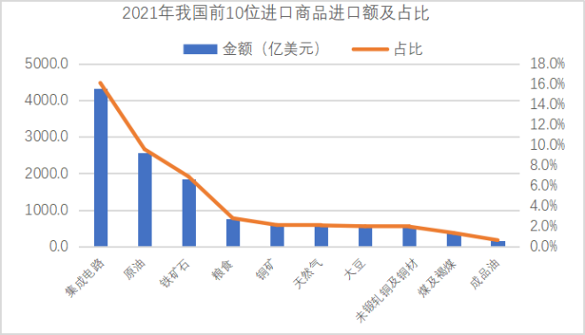 2021年,我國鐵礦石進口額高達1846.7億美元,占我國全部進口總額26875億美元的6.87%,僅次於集成電路(芯片)和原油。根據記者統計,2021年,我國進口額排名前三位的商品中,芯片進口額高達6354.8億美元,占全部進口總額的16.10%;原油進口額2573.3億美元,占進口總額的9.58%;鐵礦石進口額1846.7億美元,占進口總額的6.87%。這三大商品進口額均超過1500億美元,遠高於其他商品。