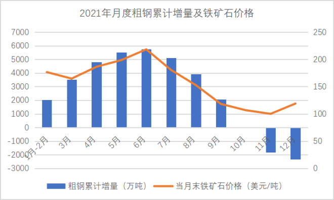 回顧2021年,鐵礦石價格走勢可謂跌宕起伏。2021年年初,工業和信息化部的年度工作會議上首次提出2021年鋼鐵行業最重要的目標之一就是壓減粗鋼產量。產能產量“雙控”成為2021年鋼鐵行業的最重要主題之一。那麼,2021年實施的產能產量“雙控”成效如何?