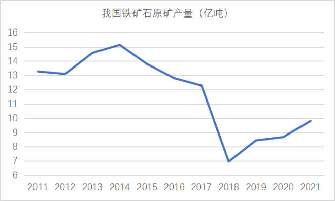根據國家統計局發布的最新數據,2021年,我國黑色金屬礦采選業固定資產投資額增長26.9%,增速創近十年新高。根據相關資料,2021年1-11月份,根據不完全統計,僅河北省共批複鐵礦石相關項目155個,已經遠遠超過2020年全年89個項目審批數量。對應地,2021年國內生產鐵礦石原礦產量達到98052.8萬噸,同比增長9.4%。