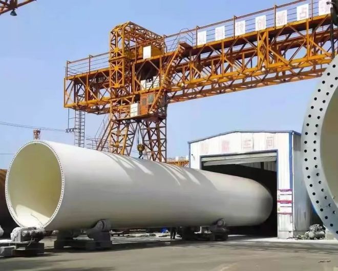 使用單位正在吊裝卷曲成型的普陽鋼鐵風電塔筒鋼