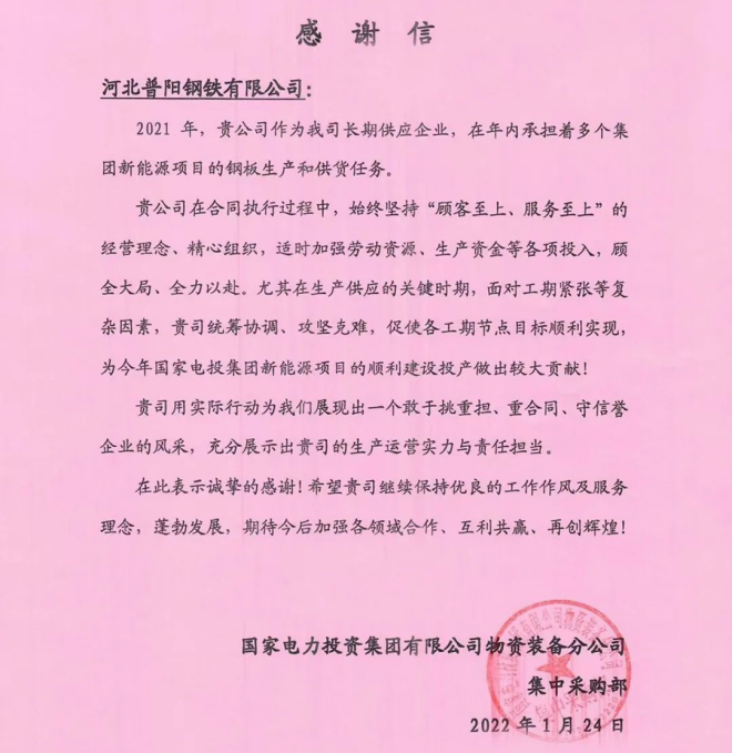 憑借過硬的產品質量,普陽鋼鐵成為國電投華北、東北地區風電塔筒鋼板的獨家供應商。截至目前,普陽鋼鐵累計獲得國電投20萬噸產品訂單,產品受到客戶一致好評。