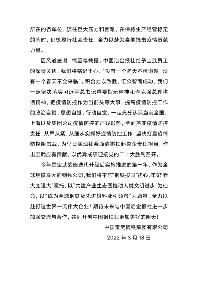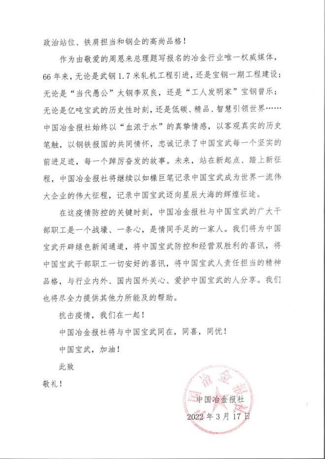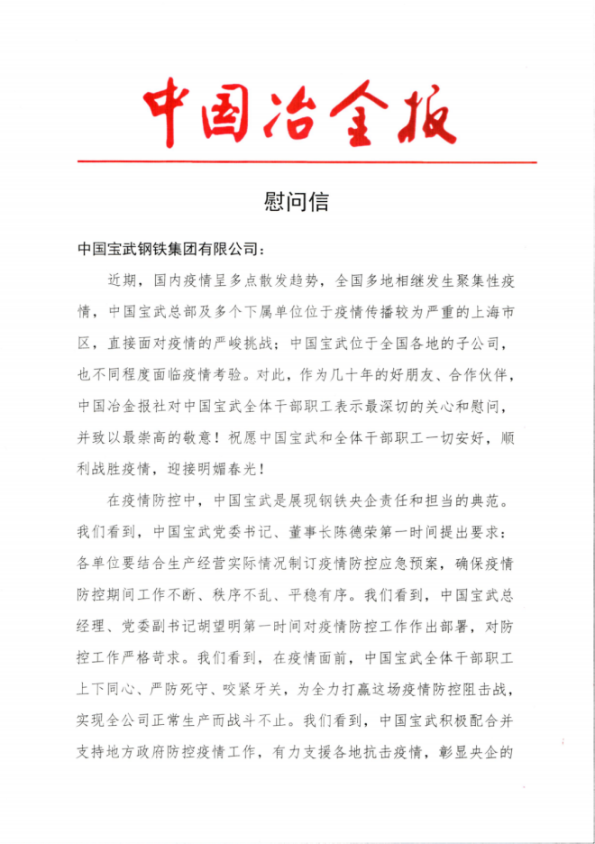 中國冶金報社致中國寶武的慰問信 ·