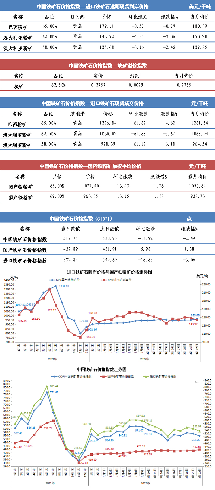 【行業指數】3月22日中國鐵礦石價格指數