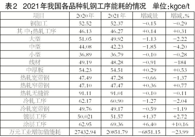 2021年鋼協會員單位各品種軋鋼工序平均能耗的情況見表2(缺少冷軋窄帶鋼項目數據)。