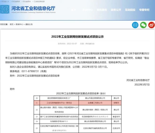 好雨知時節,捷報頻相傳。2022年3月,河北省工業和信息化廳發布公示,50個項目為2022年工業互聯網創新發展試點項目,其中金鼎鋼鐵集團有限公司(以下簡稱金鼎鋼鐵集團)《工業互聯網數智化平台一期項目》獲此殊榮。
