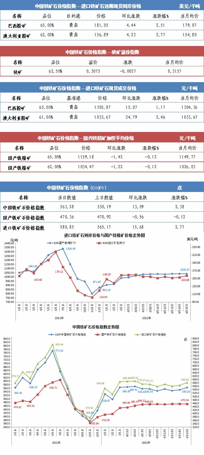 【行業指數】4月15日中國鐵礦石價格指數