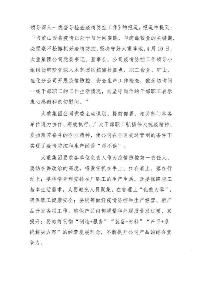 信中提到,在疫情防控中,太重集團用自己的行動展示了國企的責任和擔當。太重集團公司黨委主動謀劃、提前部署,相關部門和各單位通力協作、高效執行,廣大幹部職工弘揚偉大抗疫精神、發揚艱苦奮鬥的企業精神,使公司在全區交通管製的條件下實現了疫情防控和生產經營“兩不誤”。