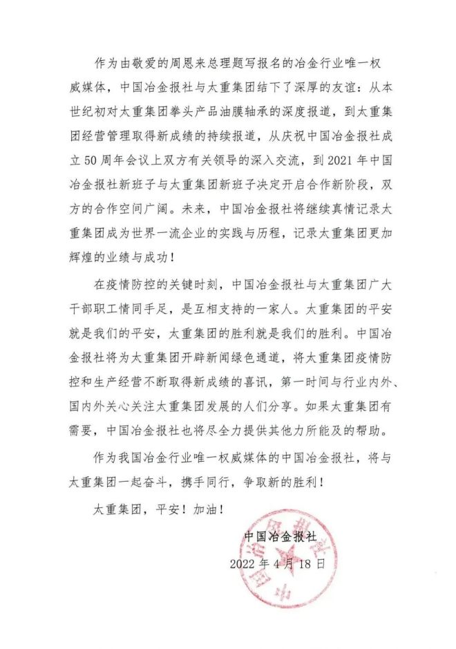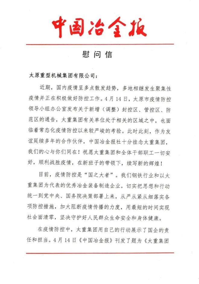 4月14日,太原市疫情防控領導小組辦公室發布關於新增(調整)封控區、管控區、防(fang)範(fan)區(qu)的(de)通(tong)告(gao),太(tai)重(zhong)集(ji)團(tuan)有(you)關(guan)單(dan)位(wei)處(chu)於(yu)相(xiang)關(guan)的(de)區(qu)域(yu)之(zhi)中(zhong),也(ye)麵(mian)臨(lin)著(zhe)常(chang)態(tai)化(hua)疫(yi)情(qing)防(fang)控(kong)以(yi)來(lai)較(jiao)嚴(yan)峻(jun)的(de)考(kao)驗(yan)。作(zuo)為(wei)友(you)誼(yi)延(yan)續(xu)多(duo)年(nian)的(de)合(he)作(zuo)夥(huo)伴(ban),中(zhong)國(guo)冶(ye)金(jin)報(bao)社(she)十(shi)分(fen)掛(gua)念(nian)太(tai)重(zhong)集(ji)團(tuan),於(yu)4月18日向太重集團發去慰問信,祝願太重集團和全體幹部職工一切安好,順利戰勝疫情,在新班子的帶領下,續寫新的輝煌!