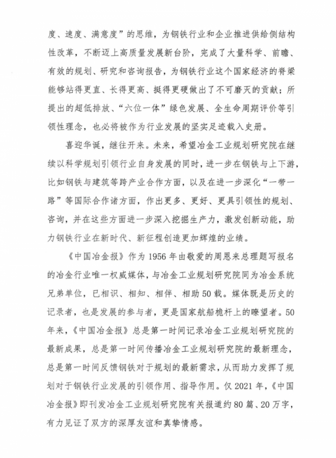 信中提到,欣聞冶金工業規劃研究院迎來建院50周年華誕,謹向冶金工業規劃研究院全體幹部職工表示最熱烈的祝賀,並致以最誠摯的問候!