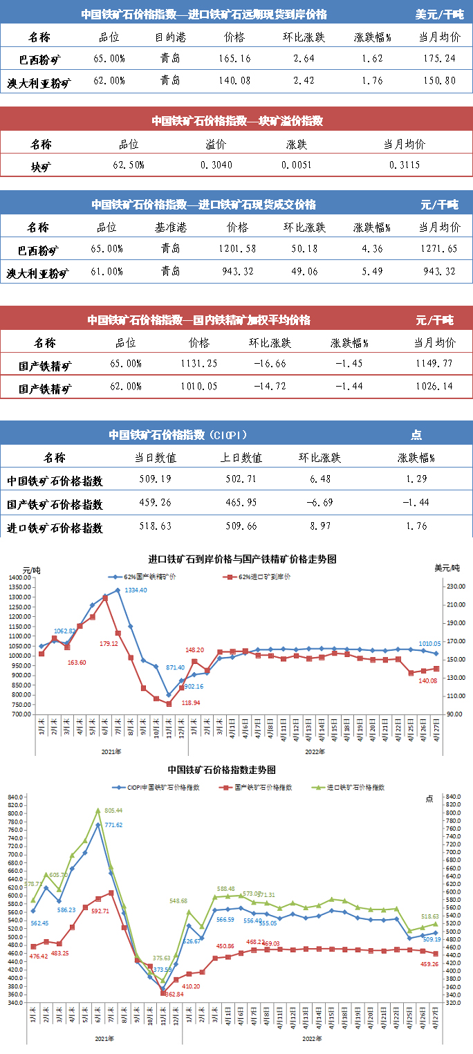 【行業指數】4月27日中國鐵礦石價格指數